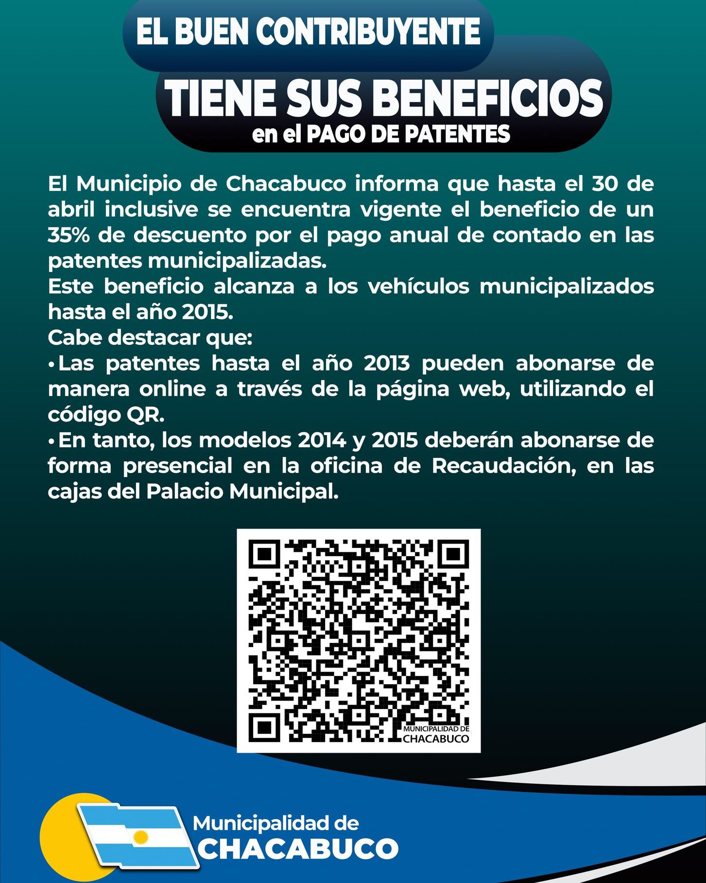 El Municipio de Chacabuco informa que hasta el 30 de abril inclusive se encuentra vigente el beneficio de un 35% de descuento por el pago anual de contado en las patentes municipalizadas.