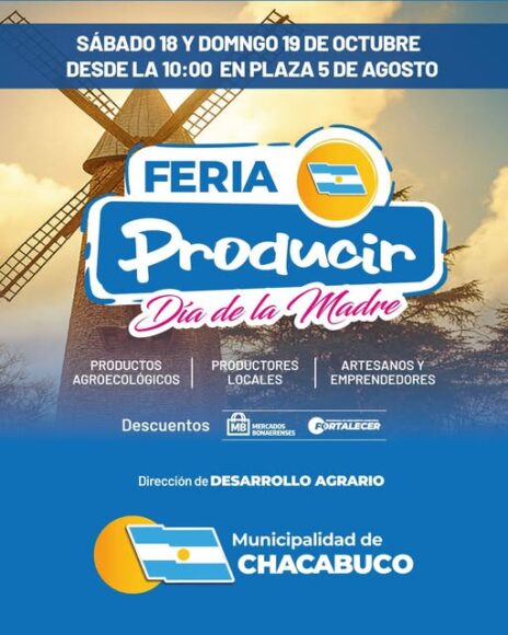 Sábado 18 y domingo 19 de octubre, desde las 10:00 en Plaza 5 de Agosto, con productos agroecológicos, artesanos, emprendedores y productores locales. Descuentos con Mercado Bonaerense y Tarjeta Fortalecer, impulsamos la producción local y el trabajo chacabuquense. Organiza: Dirección de Desarrollo Agrario