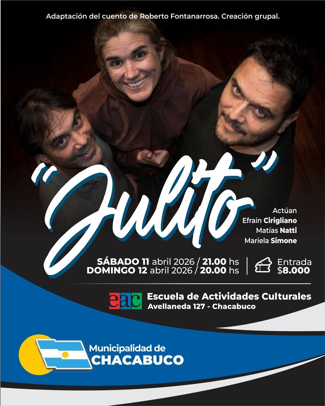 Se presenta la obra “Julito”, adaptación del cuento de Roberto Fontanarrosa, con actuaciones de Efraín Cirigliano, Matías Natti y Mariela Simone.