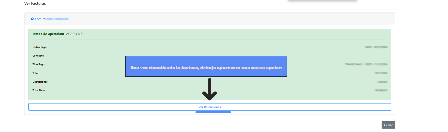 La segunda imagen se muestra una vez ingresado en la opción anterior (ver factura) le mostrara una nueva opción VER RETENCIONES